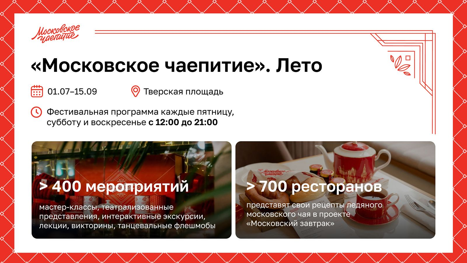 Также жители и гости столицы могут бесплатно продегустировать чайные купажи на фестивальной площадке на Тверской площади, а со 2 июля — на любых других точках проекта.