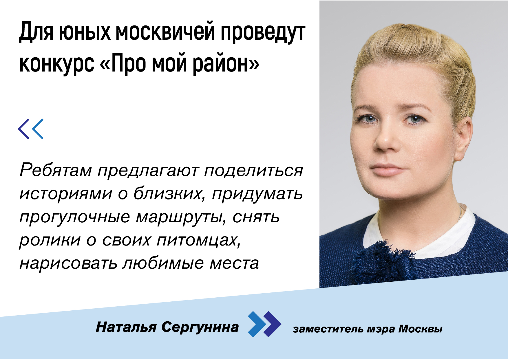 Прием заявок на четвертый сезон детского творческого конкурса "Про мой район" стартовал в Москве. Участники в возрасте от четырех до 17 лет могут прислать свои рассказы, видео, рисунки и сценарии авторских экскурсий. Об этом рассказала заммэра Наталья Сергунина.