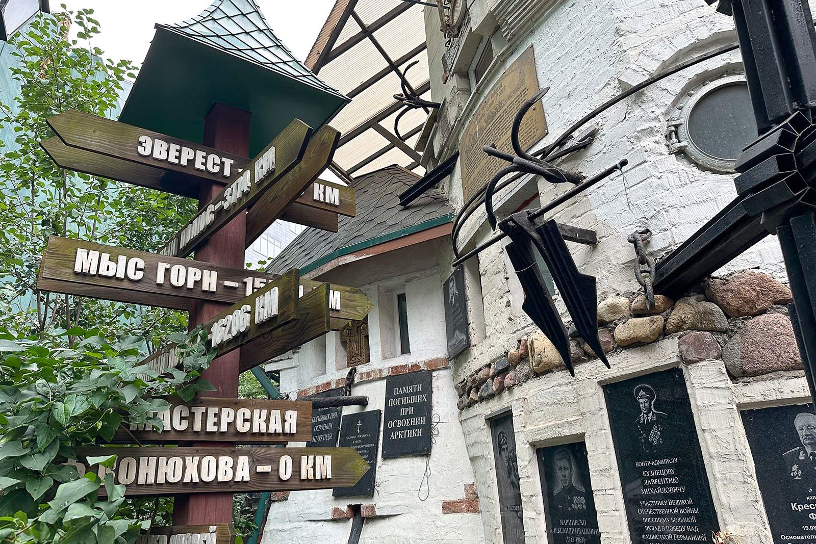 Рядом расположена большая выставка корабельных якорей, колоколов, якорных цепей, штурвалов и альпинистских ледорубов.