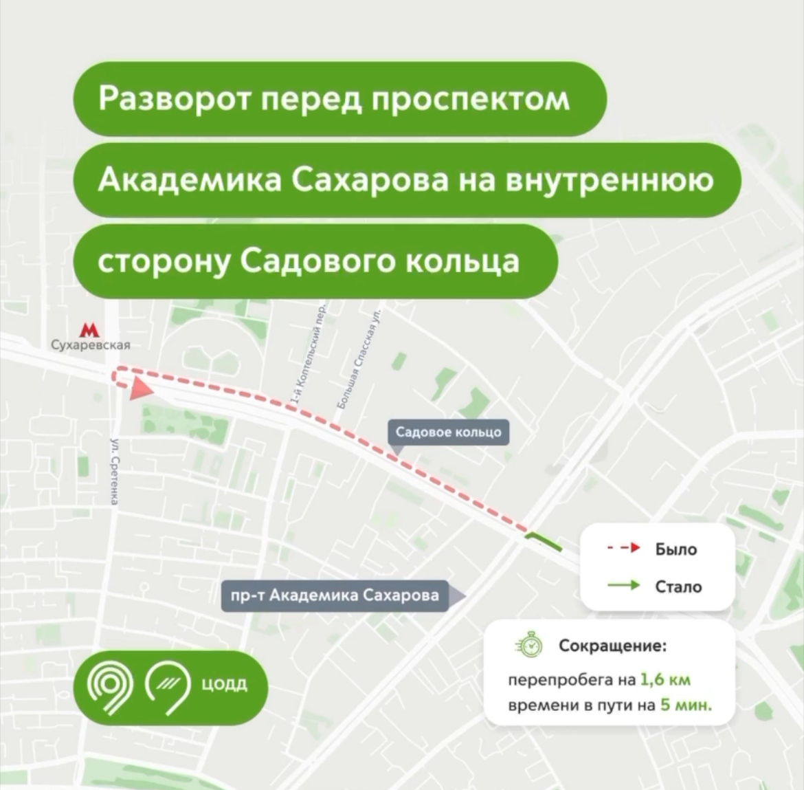 Развороты организовали с помощью переразметки, не прибегая к расширению проезжей части. Новая полоса на разворот – это отдельный ряд длиной не менее 150 м, за счет этого поток автомобилей, который едет прямо по Садовому кольцу, не замедляется.