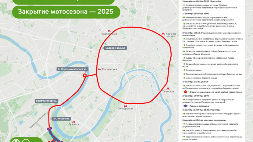 С 08:00 до 19:00 27 сентября закроют проезд по улице Косыгина от Мичуринского проспекта до дома 28, стр. 22, а также по Университетской площади от Университетского проспекта до улицы Косыгина. С 12:30 до 15:00 27 сентября — на улице Косыгина (в сторону Воробьёвского шоссе) от дома 28, стр. 22 до Мичуринского проспекта.