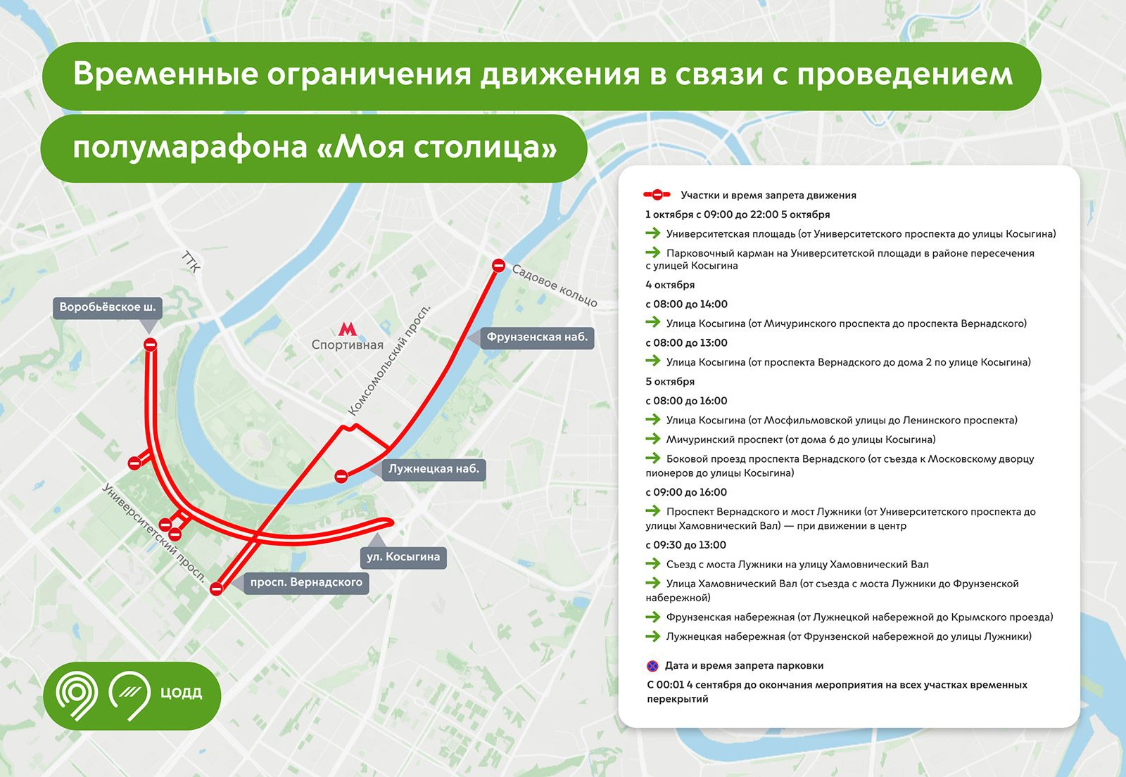 На перекрытых участках будет запрещена парковка с 00:01 4 октября до окончания мероприятия.