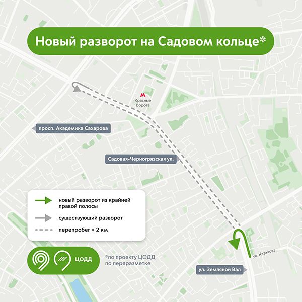 Разворот позволит развернуться с внешней стороны Садового кольца на внутреннюю на пересечении улиц Земляной Вал, Старой Басманной и Покровки. Сейчас водителям, чтобы сделать такой манёвр, приходится проезжать еще два километра после перекрестка до разворота перед проспектом Академика Сахарова и обратно, что увеличивает время в пути.