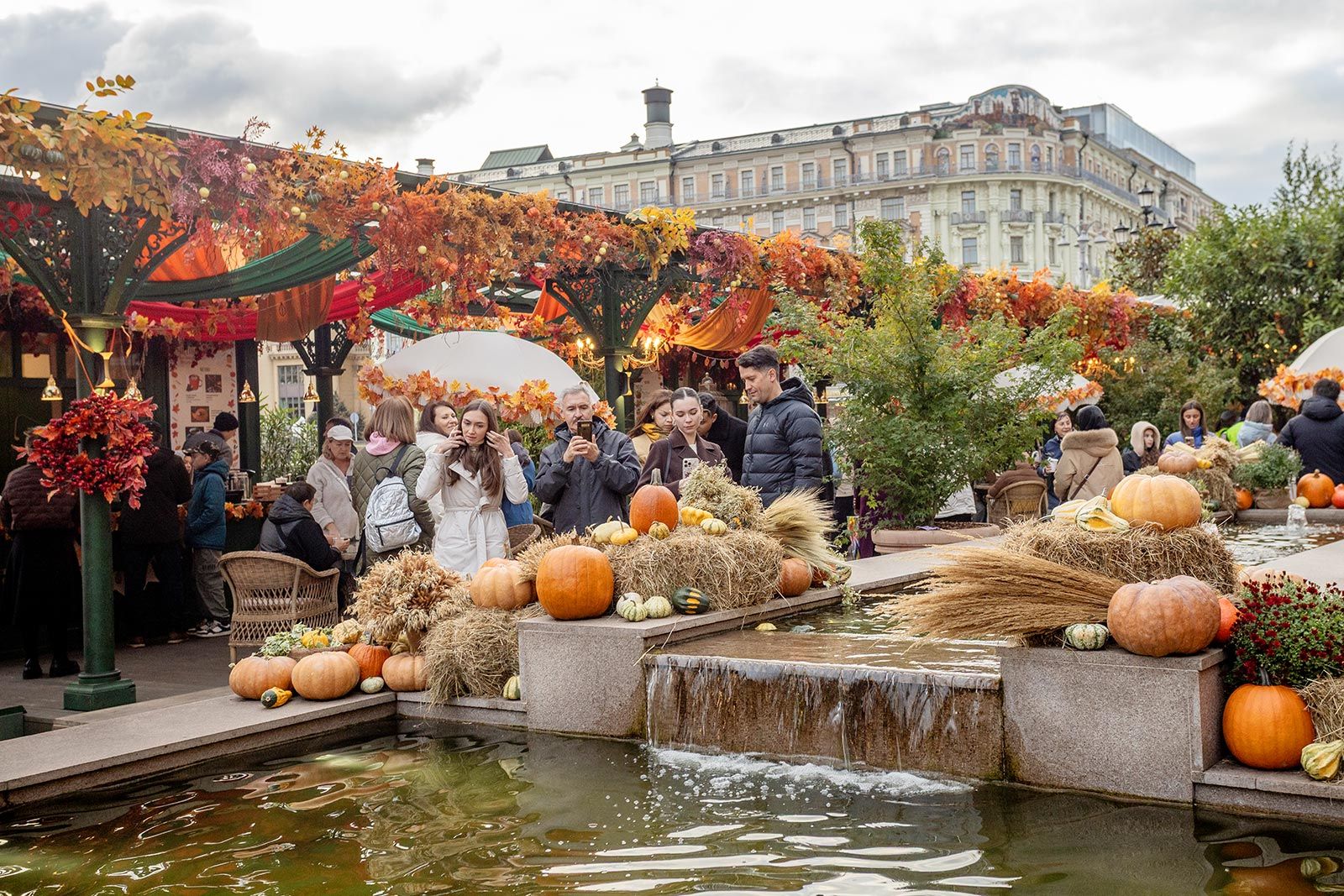 Площадка оформлена в теплых осенних тонах: рыжем, красном и желтом. Украшена тысячами тыкв разных размеров, снопами сена, пышными хризантемами и яркими деренами.