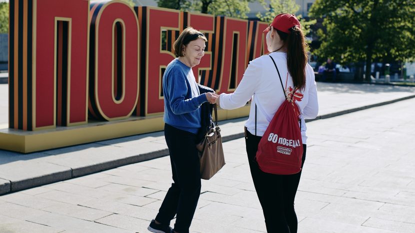 В июне волонтеры помогали гостям иммерсивного музея под открытым небом, посвященного 80-й годовщине Парада Победы 1945 года на Красной площади. Они встречали посетителей и рассказывали о программе.