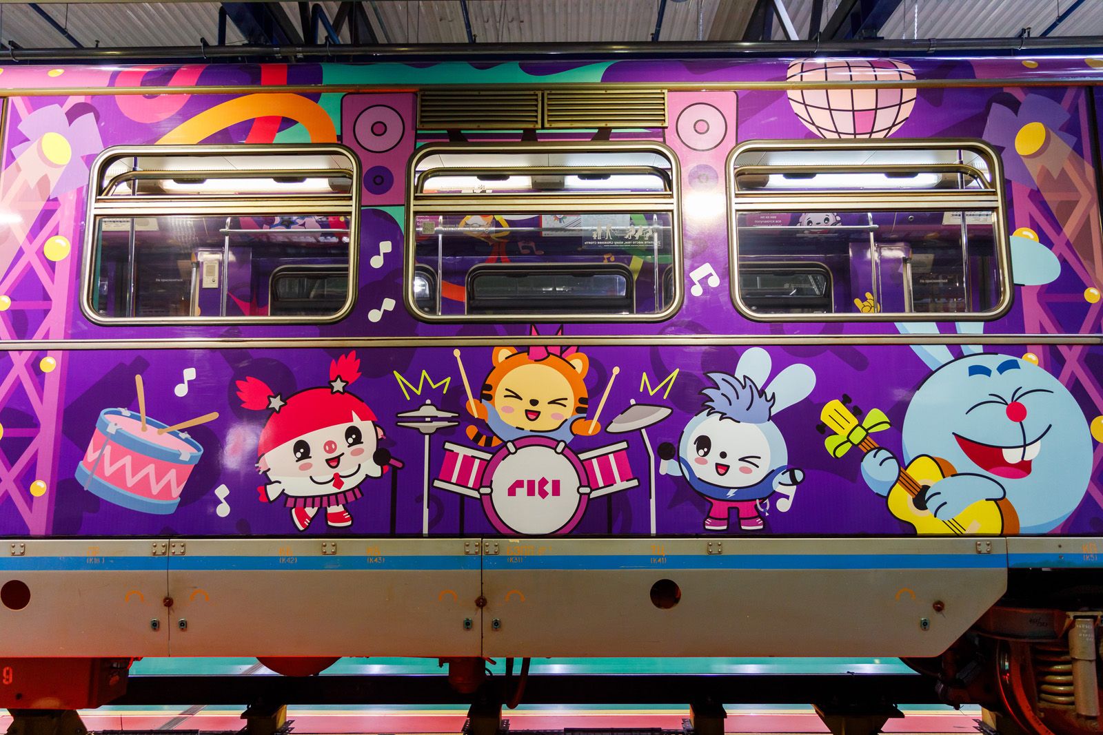 В новом поезде изображены герои из 10 популярных российских анимационных проектов. Внутри можно встретить персонажей из популярных мультсериалов группы компаний "Рики", таких как "Смешарики", "Фиксики", "Детектив Финник", "Малышарики", "Бодо Бородо" и других. Состав оформлен в ярких цветах