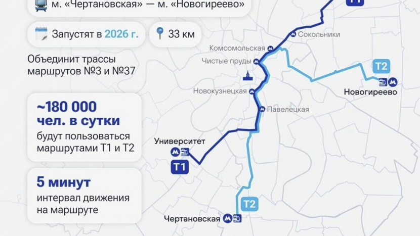 Длина маршрута Т1 - 27 километров, он соединит метро "Университет" на юго-западе с Метрогородком на востоке.