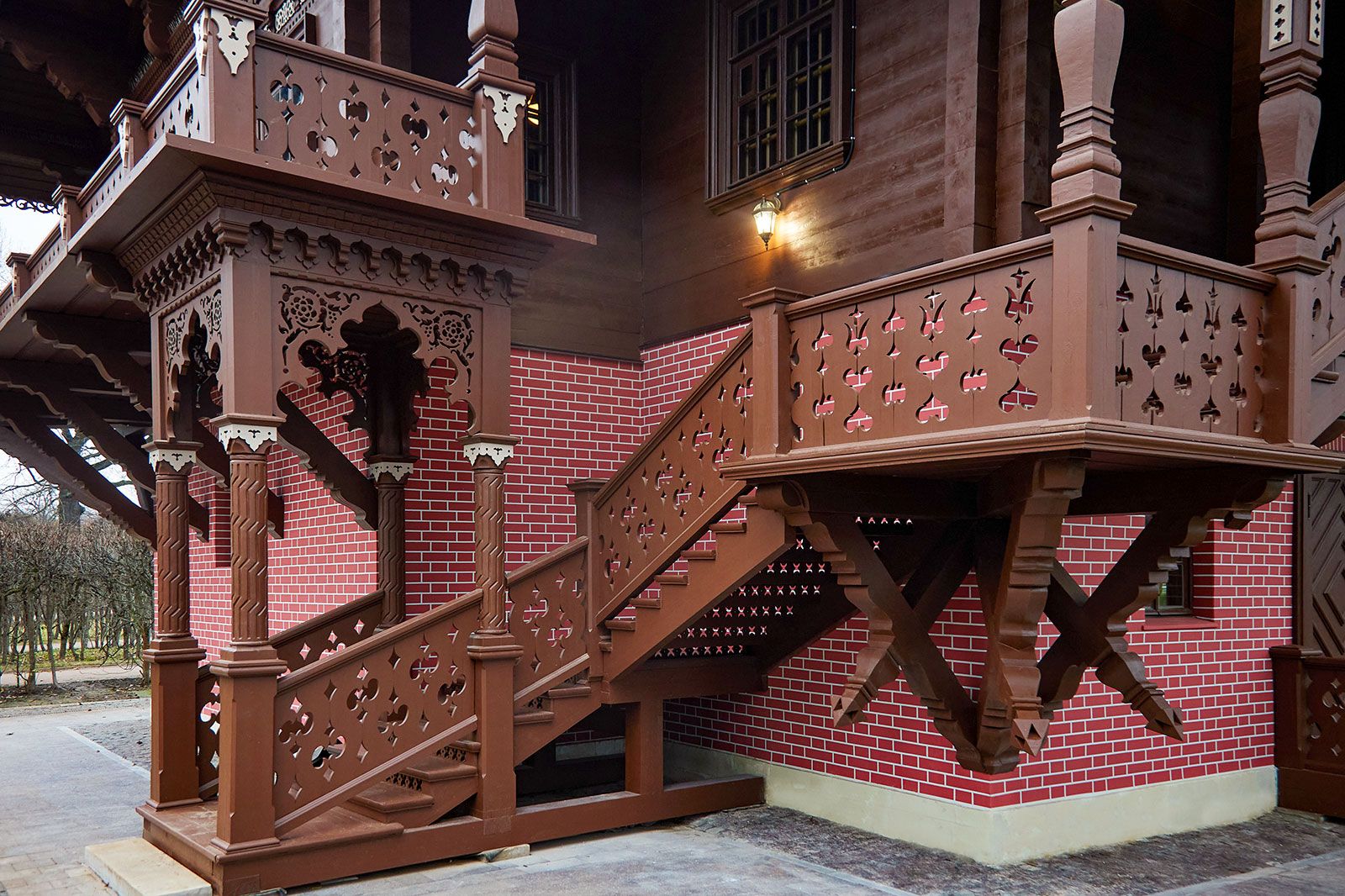 Кроме того, сделали резное деревянное крыльцо у входа. С тыльной стороны дома восстановили деревянную лестницу, ведущую на балкон.