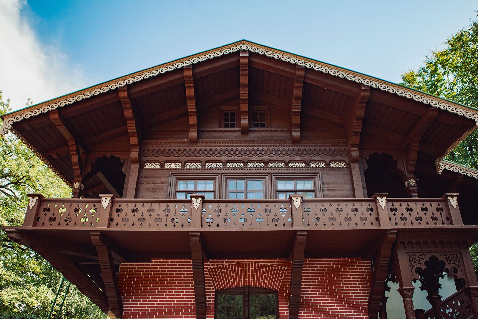 Особенное внимание уделили сохранению деревянного сруба. Во время работ его пришлось отделить от каменной части и подвесить на специальной системе, чтобы заменить поврежденный нижний венец. Специалисты также восстановили большой балкон на втором этаже, а также фигурные деревянные колонны, поддерживающие крышу.