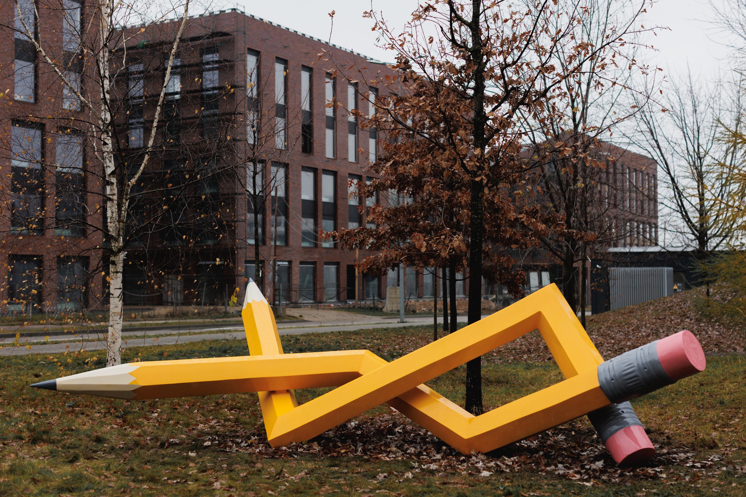 Паблик-арт-объект "Траектория мысли" Чжоу Сонга представляет собой два переплетенных желтых карандаша, которые автор метафорически определяет как синтез культуры и природы. В работе художник в равной степени вдохновлялся китайской философской традицией и идеями европейского сюрреализма.