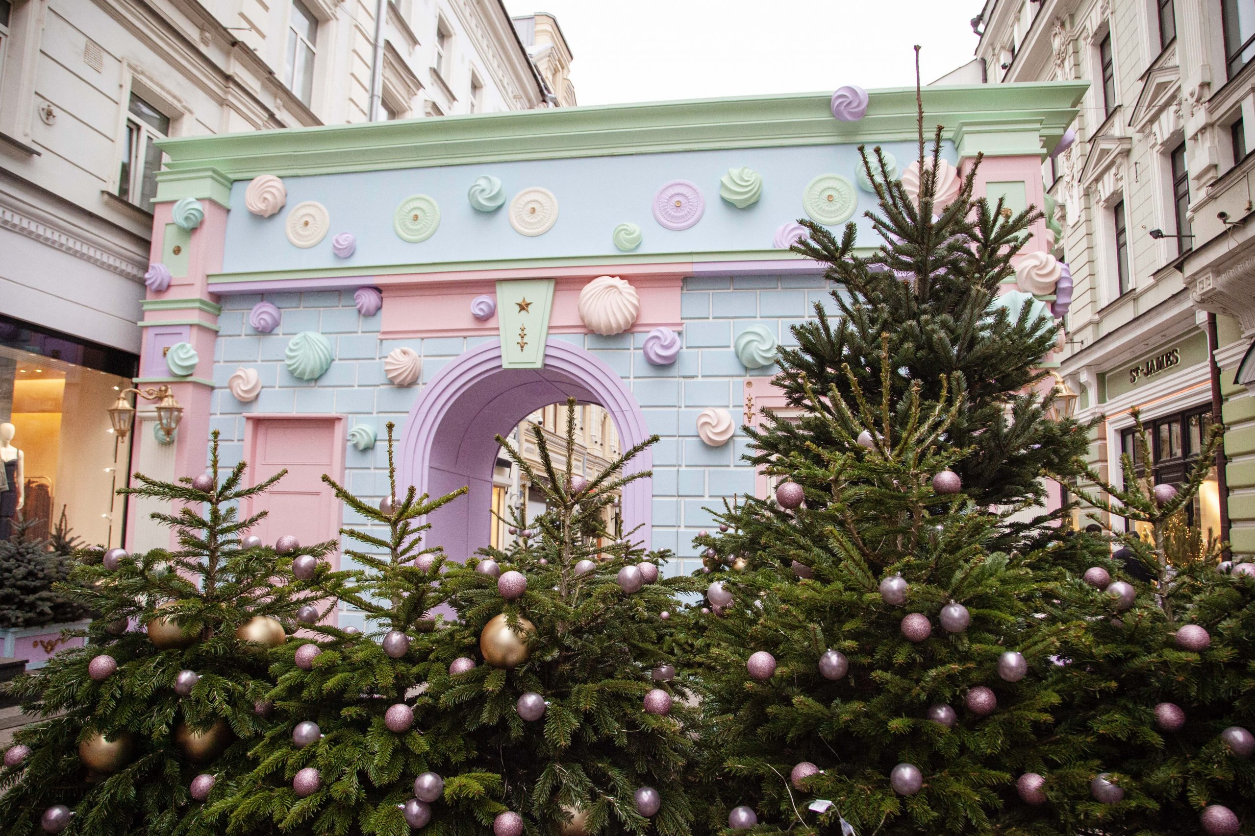 В Столешниковом переулке создали витрину кондитерской с гирляндами из зефира. А территорию у Российской государственной библиотеки стилизовали под читальный зал с большими лампами и макетами книг.