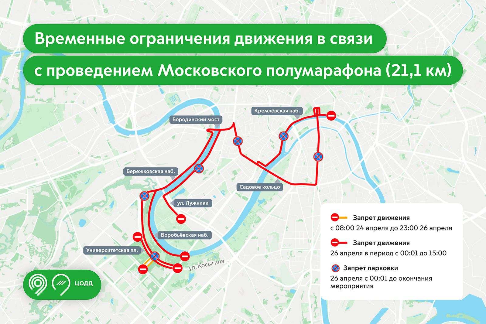 26 апреля с 00:01 до завершения мероприятия на всех перекрытых участках будет действовать временный запрет на парковку.